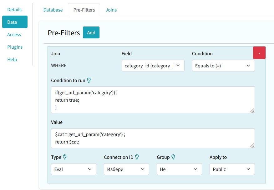 Prefilters are used to filter the list based on various conditions that will be added to the main SQL query. They can be added when editing an already created list.